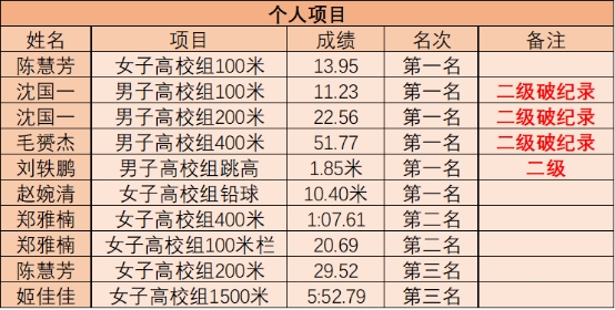 经过三天激烈角逐,我校代表队在张洋静老师的带领下斩获7金4银2铜,位列金牌榜第一名,女子团体总分第二,男子团体总分第二,团体总分第二的好成绩。其中,大气与遥感学院2022级陈慧芳以13.95秒的成绩获得女子100米冠军,电子信息与工程学院2022级沈国一以11.23秒的成绩获得男子100米冠军、以22.56秒的成绩获得男子200米冠军,物联网工程学院2021级毛赟杰以51.77秒的成绩获得男子400米冠军,自动化学院2023级刘轶鹏以1.85米的成绩获得男子跳高冠军,电子信息与工程学院2023级赵婉清以10.40米的成绩获得女子铅球冠军。
